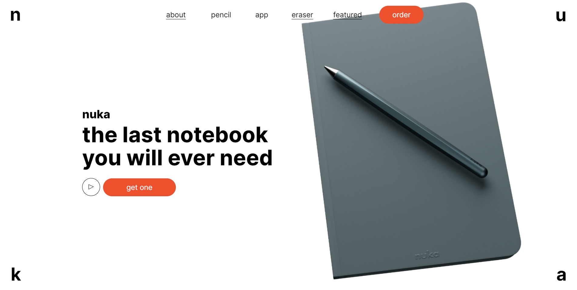 Nuka는 영원한 차세대 노트를 만드는 스타트업입니다. Nuka는 원페이지 방식을 사용하여 웹사이트를 구축했습니다. 노트를 홍보한다는 목적이 잘 들어나게끔 마치 실제 사이즈의 제품을 보는 듯 노트 제품을 크게 배치한 것이 눈에 띄는데요. 스크롤을 내리다 보면 텍스트 위주의 설명서가 없어도 사용법을 알 수 있을 정도로 이미지와 키워드를 직관적으로 배치한 것이 특징입니다. 회사 소개는 단 한 줄로만 표현하고 제품 소개에 집중한 모습이 미니멀리즘을 가장 잘 활용한 사례라 생각됩니다.